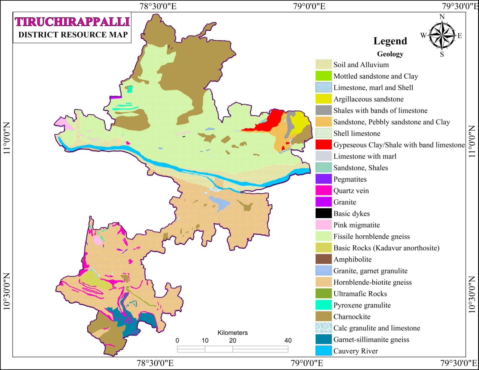 The Tiruchirappalli district exposes crystalline rocks of Archaean and Proterozoic age, Upper Gondwana Formations, sedimentary rocks of Mesozoic age, Miocene and Quaternary sediments.
